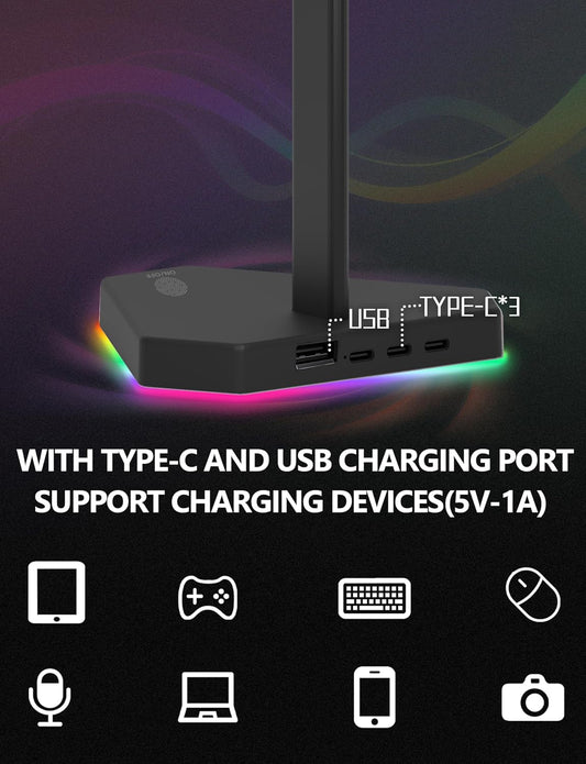 Soporte para auriculares RGB con 1 puerto USB-C para transmisión de datos y 3 puertos de carga tipo C